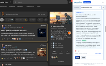 Pour utiliser SkoolFeed, il suffit d'installer l'extension, de se connecter à votre communauté Skool, et de copier l'URL de votre flux RSS. Les différents plans d'abonnement offrent des options variées : le plan gratuit permet d'accéder à une communauté avec un historique de 5 jours, tandis que les plans Pro et Agency étendent les capacités à plusieurs communautés et historiques plus longs. SkoolFeed est idéal pour les créateurs de contenu, les gestionnaires de communautés, et les agences qui souhaitent gérer efficacement leurs activités sur Skool.